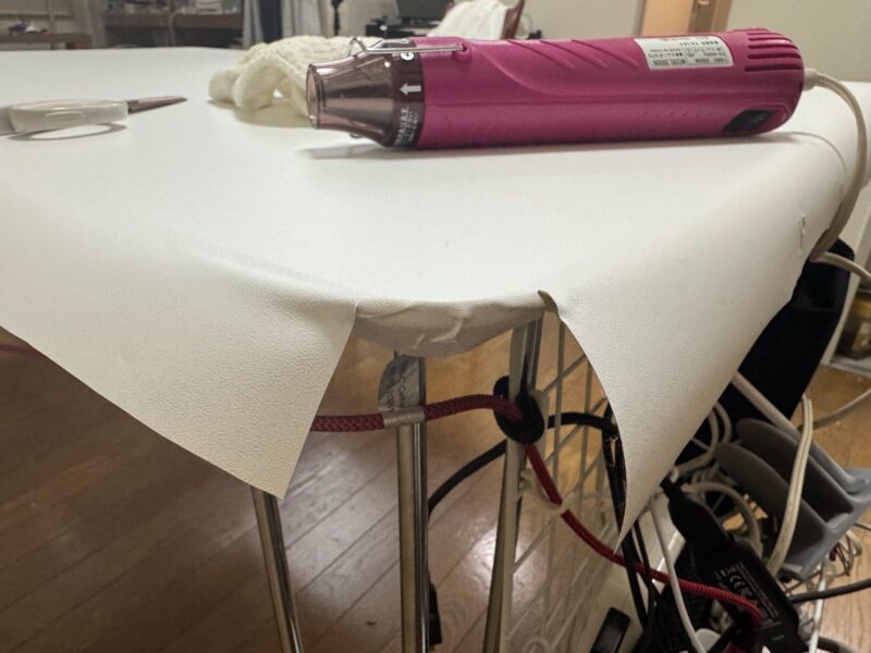 リアテックは不燃らしいですが、熱で結構柔らかくなるので、コーナー部分は切れ込みをいれて、ヒートガンで熱して伸ばしながら貼ると上手くいきました。