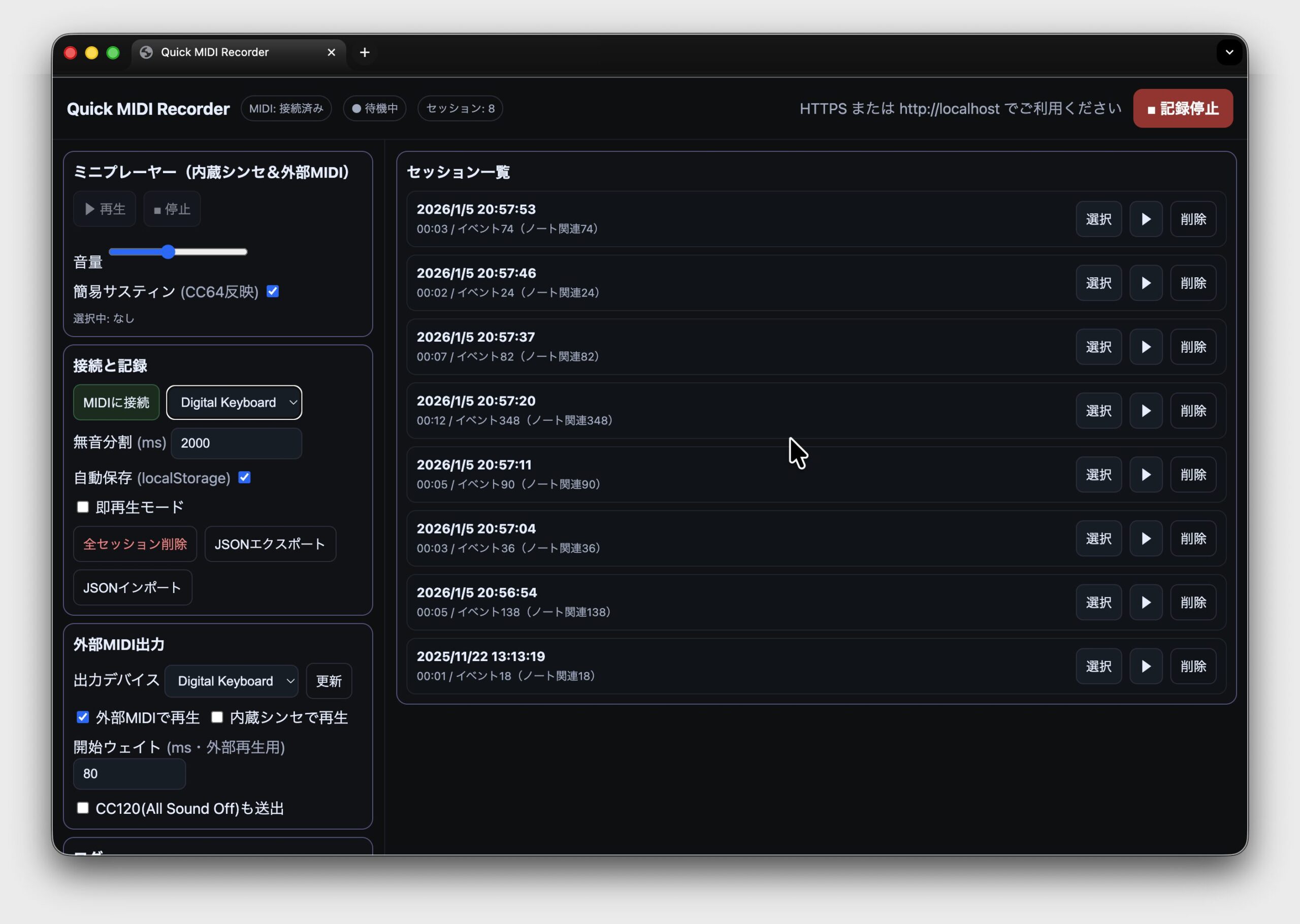 このアプリは、基本的にはブラウザベースのMIDI録音アプリです。